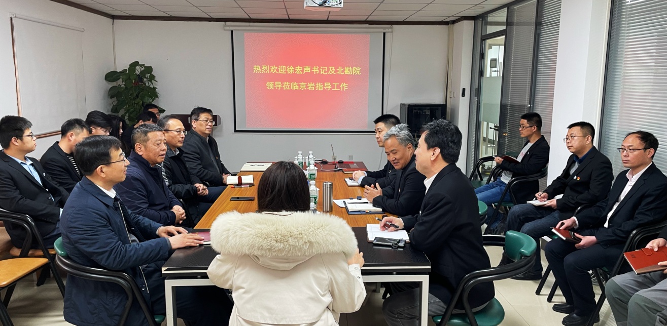 3月17日,北勘院党委书记董事长徐宏声、党委副书记张运初、副总经理张彦峰一行五人到公司进行调研指导,公司总经理贾志远带领管理层、室主任及以上人员、全体党员参加座谈会议。